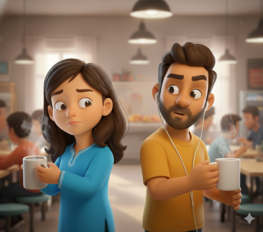 Dev only laughed, steering him forward until they reached the pantry a cozy chaos of people, steaming kettles, and the faint, sugary smell of overbrewed chai. The air buzzed with laughter and the low hum of gossip. Someone's phone played "raanjhanaa hua mai tera" softly in the background, like the universe was setting up a scene it knew too well.