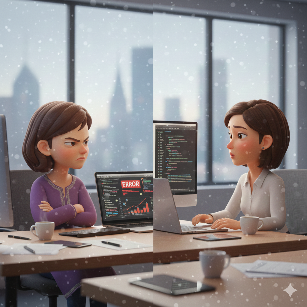 Across the building, on the Dev floor, Sameer was fighting the same battle except Dev’s version was louder, noisier, and about as accurate as a drunk SQL query.